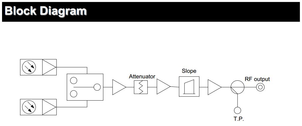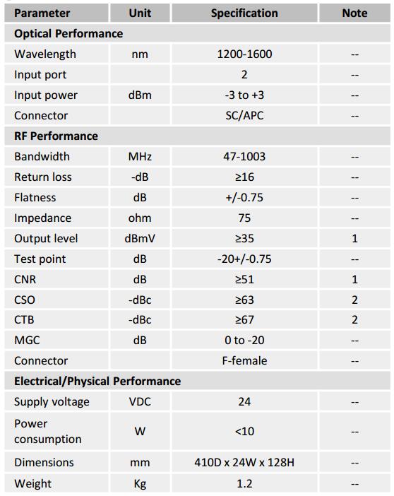 2.35dBmV output, +3dBm optical input,OMI=3.3%, NTSC 77 channels loading