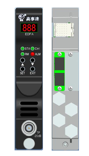 23dBm). This EDFA module is an ideal solution for both analog and digital signal transmission. The MCU circuit fully monitors the status and controls the parameters via remote communications. All these can be achieve either locally through the front panel LED, on the EDFA module or remotely with software.